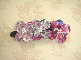 造花の花びら1つ1つにリバティの布を貼り付けて作ったのですが、全体的に少しお花にボリュームが足りないような気がします。