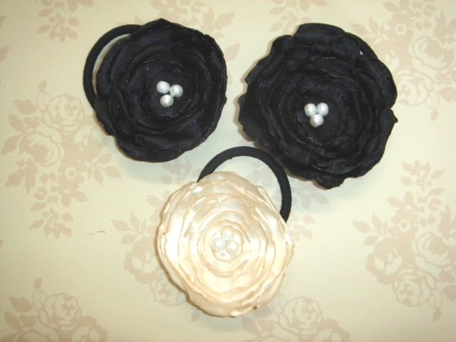 さて、先日ちょっとだけご紹介したサテンのお花をいくつかお店用に作ってみました。