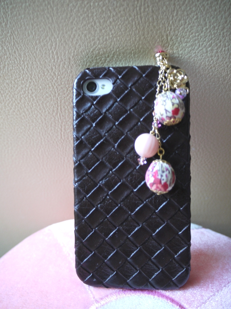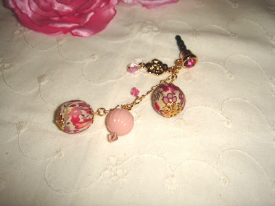 布に合わせて、アクリルビーズやスワロ、チェコビーズ、そしてイヤホンジャック本体のストーンのお色もピンク系で統一させていただきました。