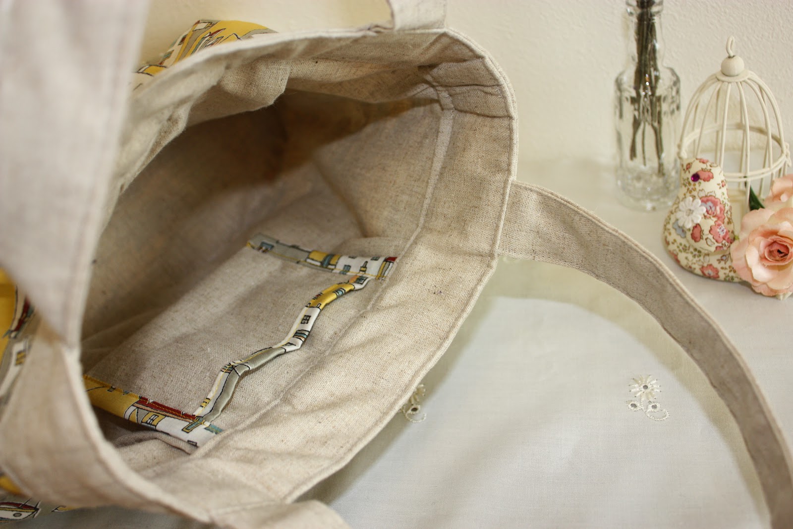 内袋や袋口、持ち手などはナチュラル色のリネン生地を使用しています。