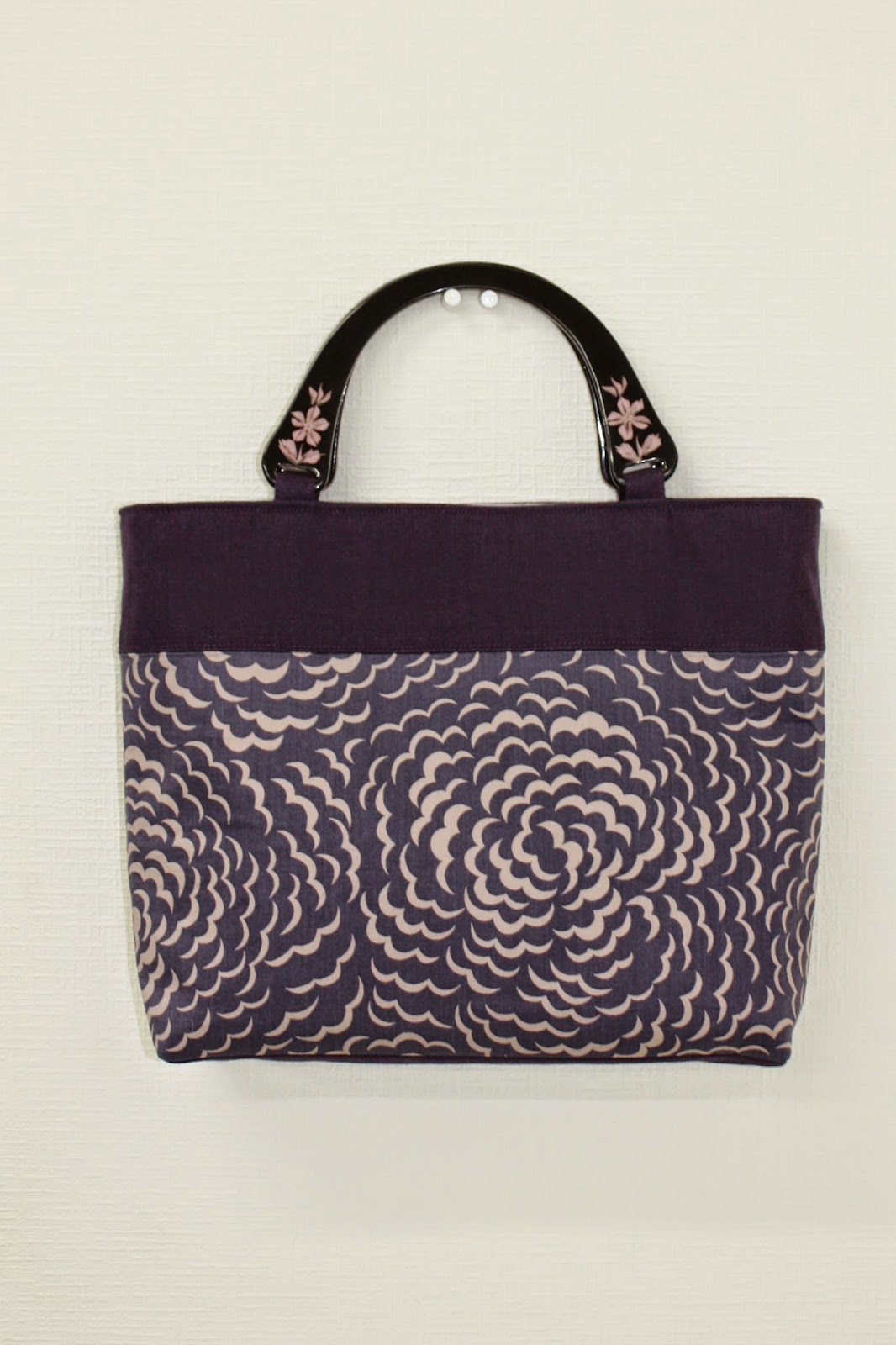 またスミレ色のPuffを使用したバックには木製(お花の模様入り)の持ち手を使用しました。