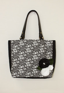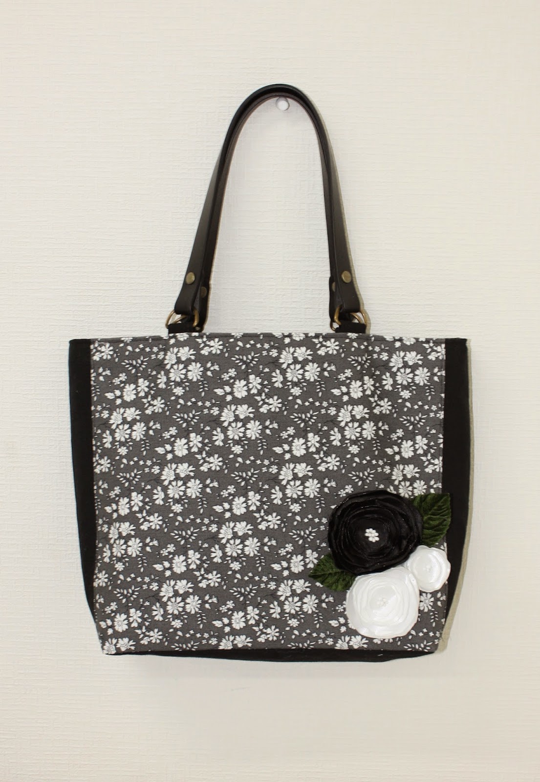 基本的にはトートバックの応用なのですが、今回初挑戦だったのがサテンのコサージュを付けたバック。