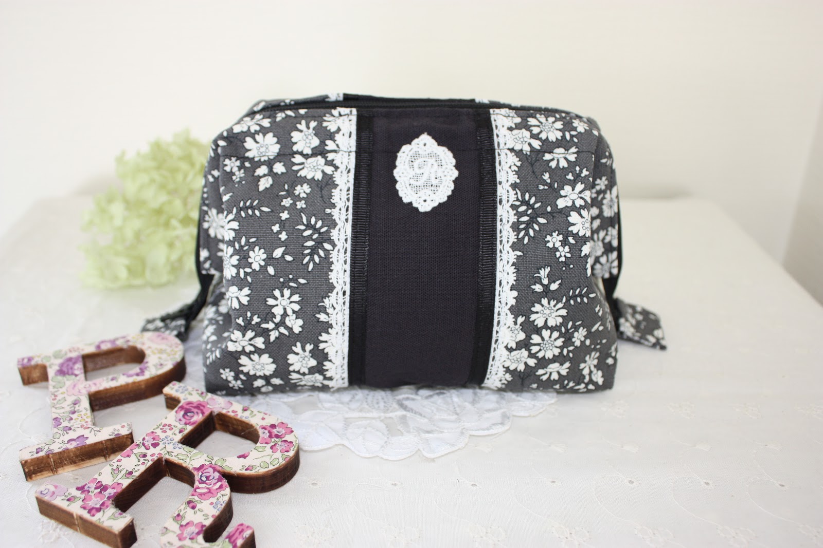 こちらをメインにチャコールグレーの無地キャンパス、レース、グログランリボンなどを組み合わせて作ってみました。