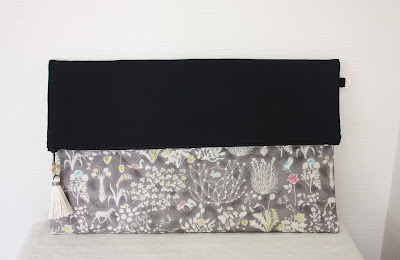 表地はグレーのYoshieキルティング生地(ホビーラさん限定生地の縮小柄きらめき加工入りのもの)、裏はブラックの綿麻キャンバス生地を使用しています。