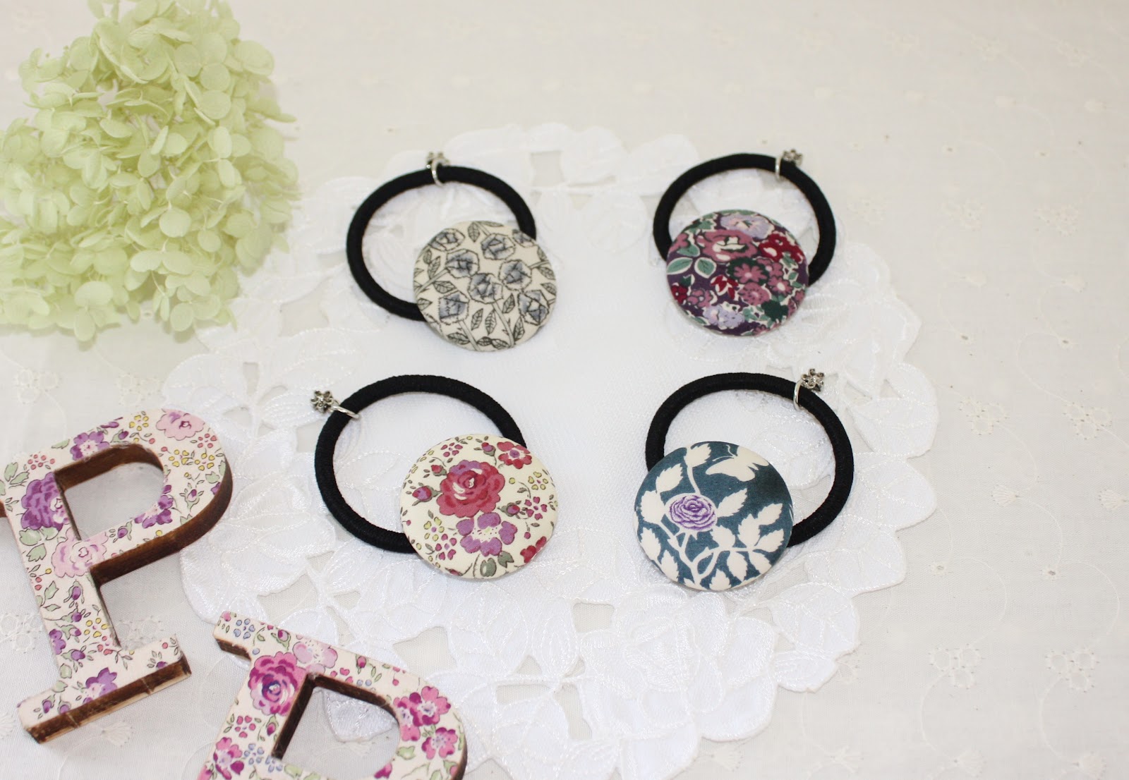クルミボタンのヘアゴム 各¥600 左上:Sleeping Rose 右上:Tatum 左下:Felicite*SOLD* 右下:Yoshie*SOLD* |