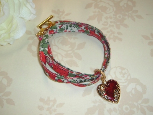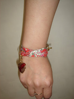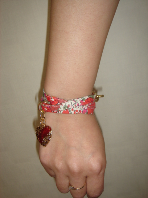 リバティの生地を使って、紐に通した12mmのビーズを1つ1つ丁寧にくるんでは縛っていきます。