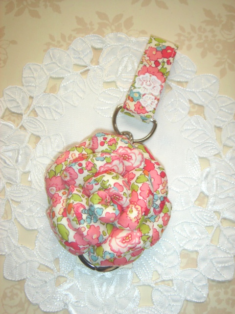 お花の裏側に大き目のキーリングがついていますので、そちらにお手持ちのキーをつけてください。